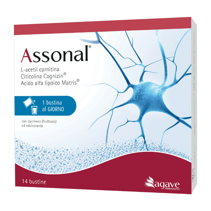 Assonal è un integratore alimentare formulato con L-acetil carnitina, acido alfa-lipoico (Matris), citicolina (Cognizin) e vitamine del gruppo B, utile per il sostegno delle neuropatie periferiche e del sistema nervoso. Grazie alla combinazione dei suoi principi attivi, contribuisce alla salute delle membrane cellulari, alla produzione di acetilcolina e al benessere energetico dell’organismo.