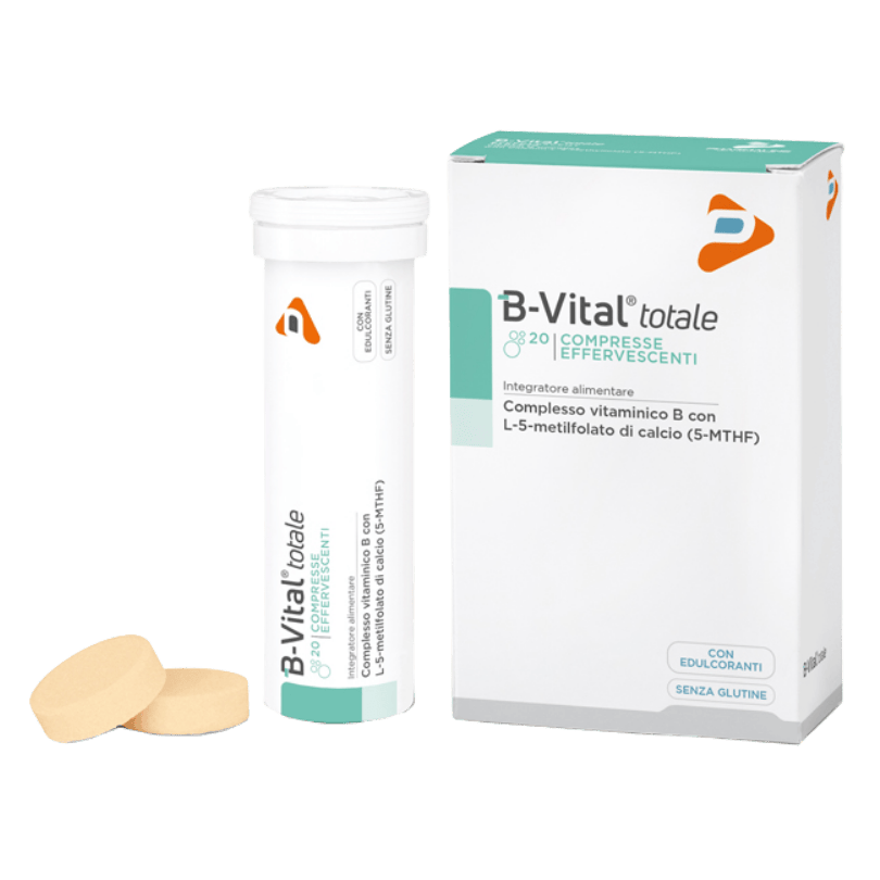 B-Vital Totale Effervescente è un integratore alimentare polivitaminico a base di vitamine del gruppo B, studiato per supportare il metabolismo energetico, il funzionamento del sistema nervoso e la riduzione di stanchezza e affaticamento. Contiene 400 mcg di folato attivato (5-MTHF), utile per la crescita dei tessuti materni durante la gravidanza.