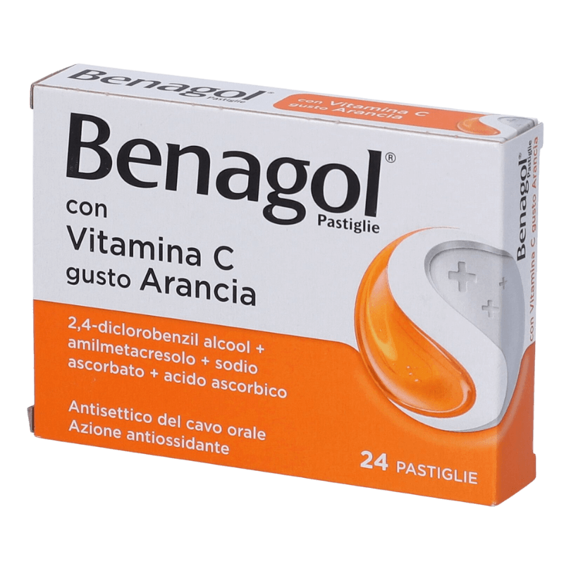 Benagol Pastiglie gusto Ginger e Spezie. Principi attivi: 2,4-diclorobenzil alcool 1,2 mg; amilmetacresolo 0,6 mg. Eccipienti con effetti noti: saccarosio liquido, glucosio liquido (contenente solfiti e amido di frumento), aroma spezie e aroma ginger (contenenti cinnamale, citrale, citronellolo, eugenolo, farnesolo, geraniolo, isoeugenolo e linalolo). Benagol Pastiglie gusto Miele e Limone. Principi attivi: 2,4-diclorobenzil alcool 1,2 mg; amilmetacresolo 0,6 mg. Eccipienti con effettinoti: glucosio liquido (contenente solfiti e amido di frumento), saccarosio liquido, menta essenza e limone essenza (contenenti citrale, d-limonene, geraniolo e linalolo), miele (zucchero invertito). Benagol Pastiglie gusto Limone Senza Zucchero. Principi attivi: 2,4-diclorobenzil alcool 1,2 mg; amilmetacresolo 0,6 mg. Eccipienti con effetti noti:maltitolo liquido, isomalto, aroma di limone (contenente alcol benzilico, citrale, citronellolo, d-limonene, geraniolo e linalolo). BenagolPastiglie gusto Fragola Senza Zucchero. Principi attivi: 2,4-diclorobenzil alcool 1,2 mg; amilmetacresolo 0,6 mg. Eccipienti con effetti noti: maltitolo liquido, isomalto, aroma di fragola (contenente propilene glicole e alcol benzilico). Benagol Pastiglie gusto Menta Fredda. Principi attivi: 2,4-diclorobenzil alcool 1,2 mg; amilmetacresolo 0,6 mg. Eccipienti con effetti noti: saccarosio liquido, glucosio liquido (contenente solfiti e amido di frumento), aroma menta e eucalipto essenza (contenenti glicole propilenico, alcol benzilico, alcol cinnamilico,citrale, citronellolo, d-limonene, eugenolo e linalolo). Benagol Pastiglie gusto Mentolo-Eucaliptolo. Principi attivi: 2,4-diclorobenzil alcool 1,2 mg; amilmetacresolo 0,6 mg; mentolo 8,0 mg. Eccipienti con effetti noti: saccarosio liquido, glucosio liquido (contenente solfiti eamido di frumento) e eucalipto essenza (contenente d-limonene). Benagol Pastiglie con Vitamina C gusto Arancia. Principi attivi: 2,4-diclorobenzil alcool 1,2 mg; amilmetacresolo 0,6 mg; sodio ascorbato 74,9 mg; acido ascorbico 33,5 mg. Eccipienti con effetti noti: saccarosio liquido, glucosio liquido (contenente solfiti e amido di frumento), aromadi arancia (contenente citrale, citronellolo, d-limonene, geraniolo,linalolo), glicole propilenico. Per l'elenco completo degli eccipienti, vedere paragrafo 6.1.