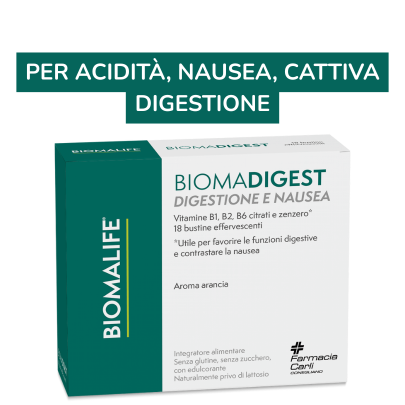 BIOMADIGEST è un integratore alimentare in bustine effervescenti a base di vitamine B1, B2, B6, zenzero e citrati, formulato per contrastare in modo efficace i disturbi digestivi più comuni.