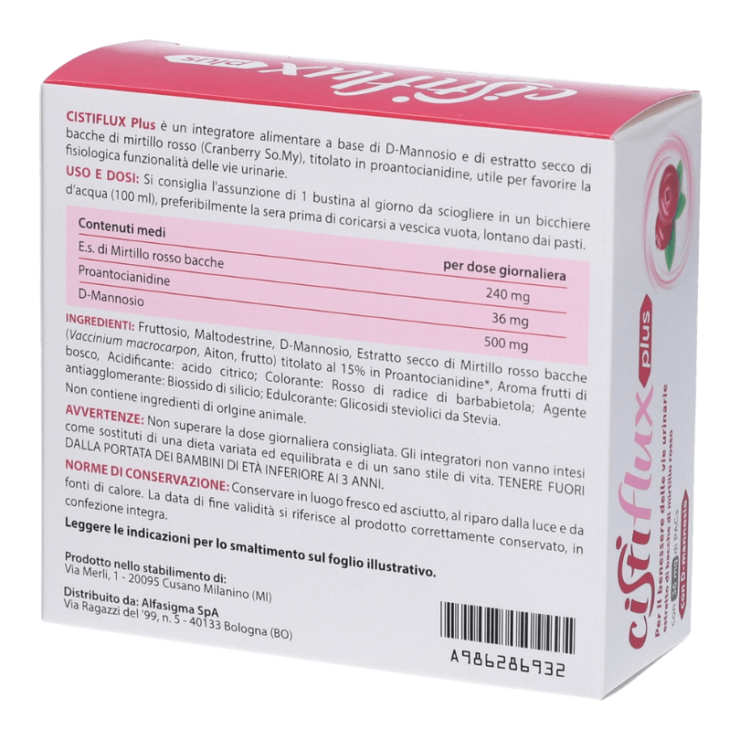 Fruttosio, maltodestrine, D-mannosio, e.s. mirtillo rosso bacche (Vaccinium macrocarpon Aiton) tit. al 15% in proantocianidine, aroma frutti di bosco; acidificante: acido citrico; colorante: rosso barbabietola; agente antiagglomerante: biossido di silicio; edulcorante: glicosidi steviolici da stevia.