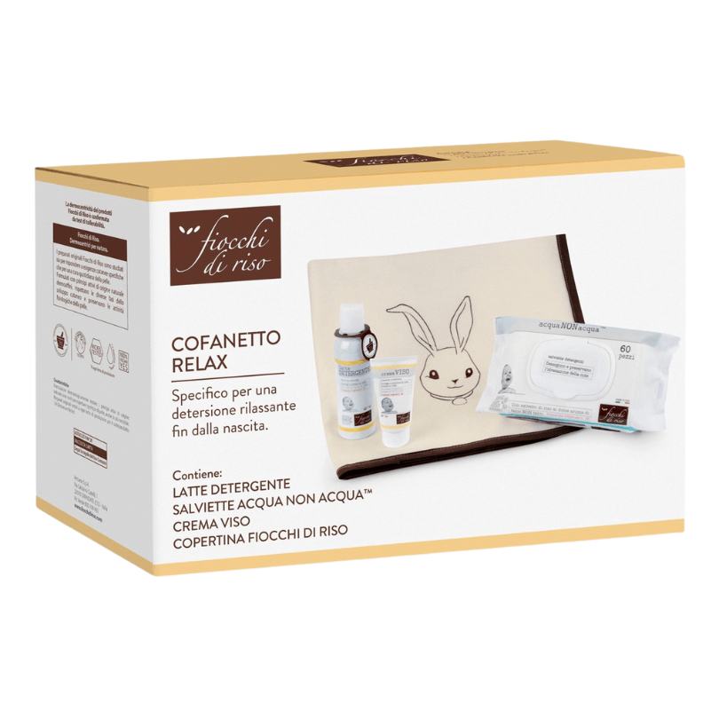 Il Cofanetto Relax Fiocchi di Riso è pensato per offrire una detersione delicata e rilassante fin dalla nascita, grazie a preparati originali formulati per rispettare la pelle sensibile dei neonati. All’interno contiene il Latte Detergente 140 ml, la Crema Viso 30 ml, le Salviette Acqua Non Acqua 60 pz e una morbida copertina ideale per coccolare i più piccoli con calore e comfort. Perfetto per la routine quotidiana, anche per pelli molto delicate.