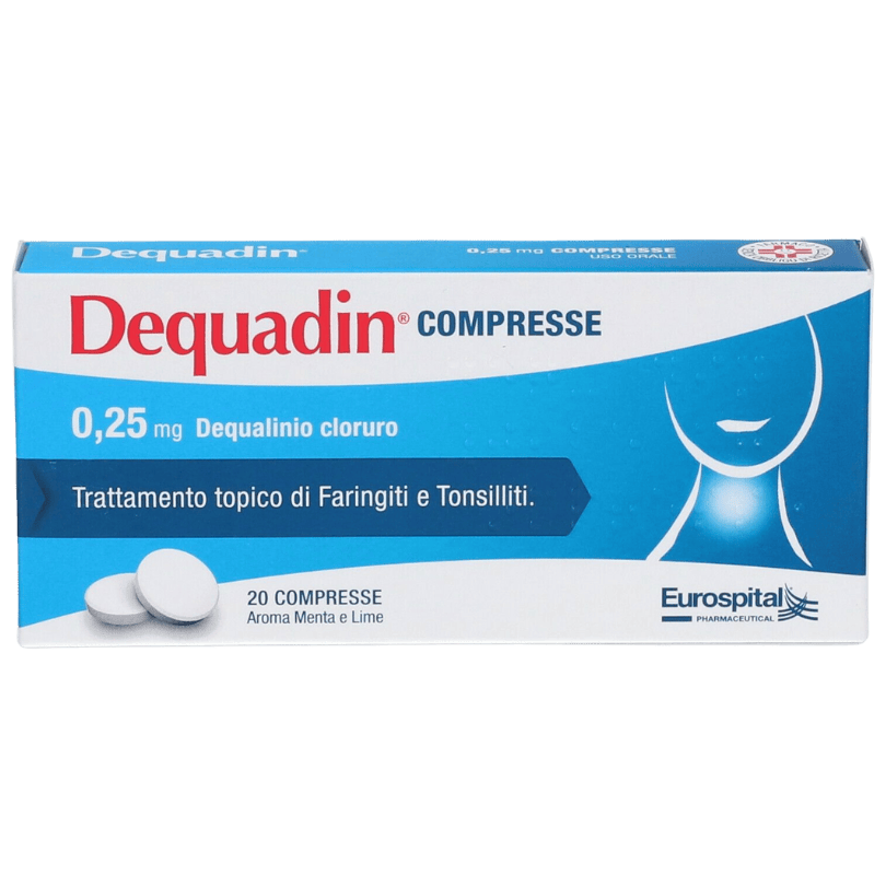 Il principio attivo presente in Dequadin è il dequalinio cloruro, noto per la sua efficacia come antisettico topico, capace di eliminare batteri e microrganismi responsabili di infezioni orali e faringee.