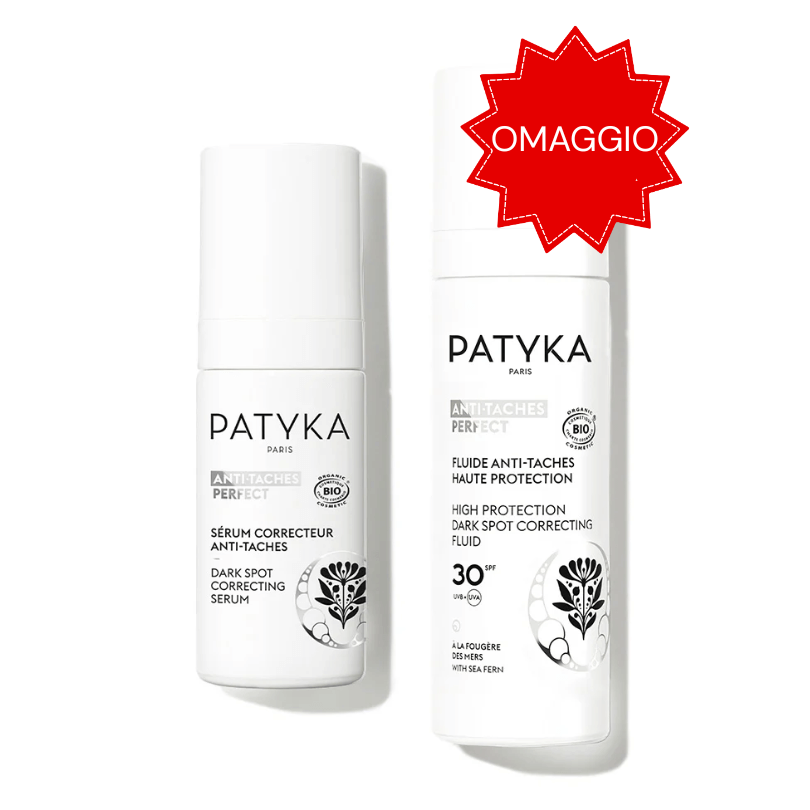 Il Duo Anti-Taches Perfect Patyka è un cofanetto completo studiato per prevenire, correggere e ridurre tutti i tipi di macchie da iperpigmentazione. Il set comprende il Siero Correttore Anti-Macchie 30 ml e il Fluido Anti-Macchie Alta Protezione SPF30 50 ml in omaggio, offrendo un trattamento giorno e notte efficace e sicuro per tutti i tipi di pelle. Grazie ad alta concentrazione di principi attivi naturali e antiossidanti, il duo uniforma l’incarnato, riduce l’intensità delle macchie e protegge la pelle dai raggi UV e dai radicali liberi, responsabili della comparsa di macchie cutanee.