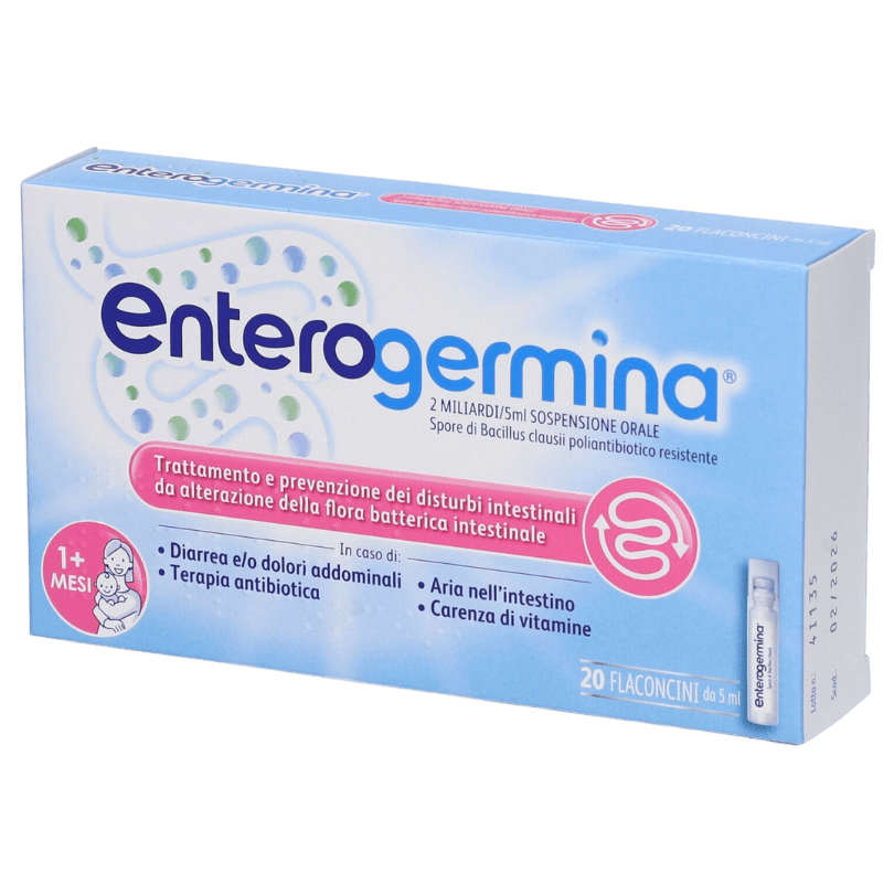 Enterogermina 2 miliardi è un probiotico orale indicato per il ripristino della flora intestinale e la prevenzione del dismicrobismo intestinale. È disponibile in flaconcini e capsule rigide, ciascuno contenente spore di Bacillus clausii poliantibiotico resistente, utili per favorire il benessere gastrointestinale durante o dopo terapie antibiotiche o chemioterapiche.