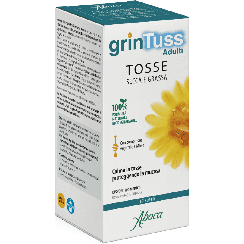 Grintuss Adulti Sciroppo è un dispositivo medico naturale a base di Poliresin (complesso vegetale brevettato) e miele biologico, indicato per il trattamento della tosse secca e produttiva negli adulti e nei ragazzi dai 12 anni in su. La sua formula è studiata per agire proteggendo la mucosa e calmando l’irritazione, favorendo l’idratazione e la rimozione del muco.