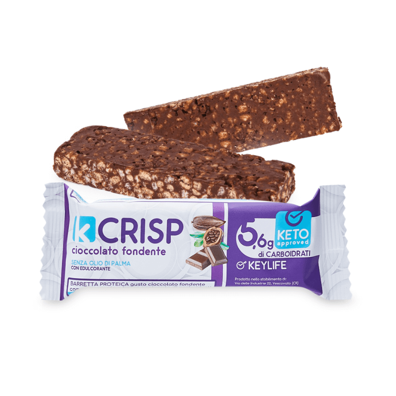 KCRISP Cioccolato Fondente è una barretta proteica al gusto cioccolato fondente, a basso contenuto di carboidrati e senza glutine, ideale per chi segue un'alimentazione bilanciata o un regime ipocalorico. Arricchita con edulcoranti e ingredienti selezionati, è perfetta come snack spezzafame o dopo l'attività fisica.