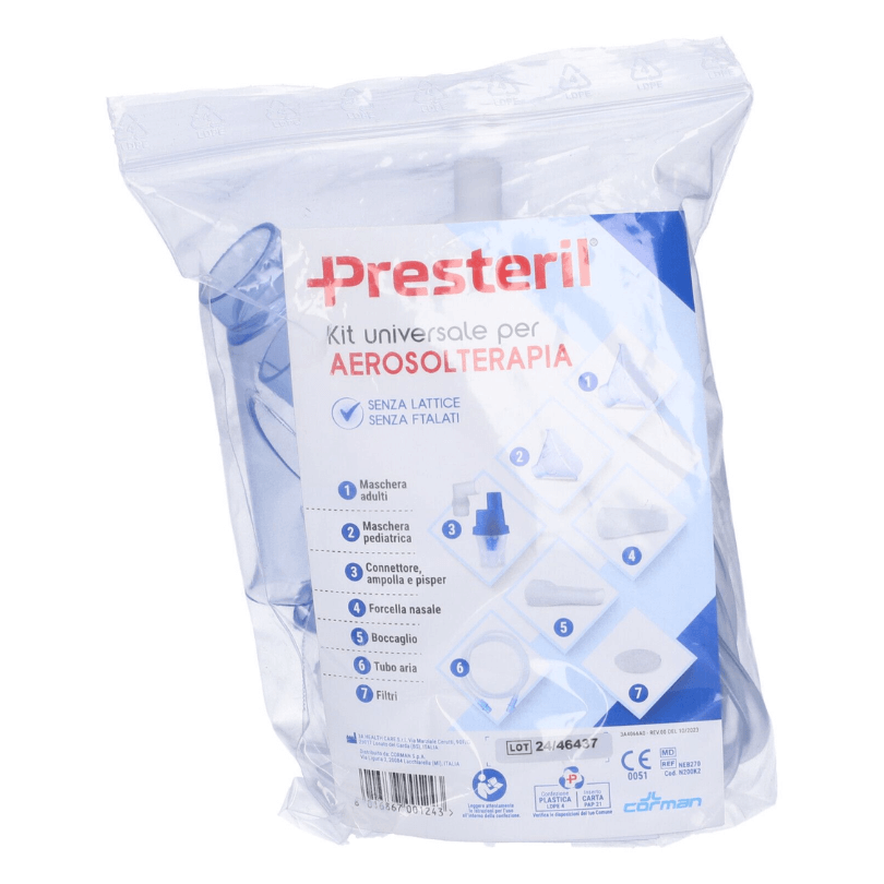 Il Presteril Kit Universale per Aerosol Farmacia Carli è un dispositivo medico completo progettato per garantire l’erogazione efficace dei farmaci per aerosolterapia.