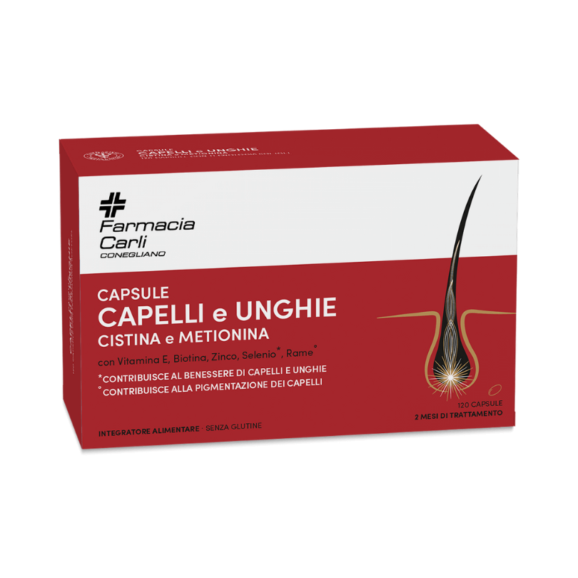 Le Capsule Capelli e Unghie sono un integratore alimentare formulato con Cistina, Metionina, Zinco, Selenio, Rame, Biotina e Vitamina E per mantenere l’integrità e la salute di capelli e unghie. Arricchite con Olio di semi di Zucca ad azione antiossidante, queste capsule contribuiscono a rafforzare la struttura dei capelli e delle unghie dall'interno.