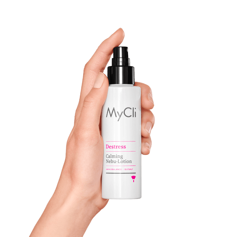 Destress Nebu-Lotion Lenitiva 100ml di MyCli è una lozione spray lenitiva e destressante indicata per viso, collo e décolleté. Questo prodotto è utile per calmare la pelle stressata o sensibile dopo trattamenti esfolianti, peeling chimici o altre procedure di medicina estetica. La sua formula innovativa con glicirrizinato di potassio (Glysalt) e Heptapeptide-4 (Aminobalance) supporta il ripristino del microbioma cutaneo, favorisce i processi riparativi della pelle e restituisce comfort immediato.