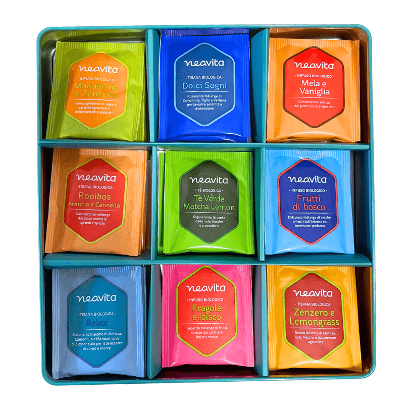 Il Natural Elisir 36 Filtri Bio Assortiti Neavita è una selezione completa di tisane e infusi biologici pensata per chi vuole godere di una varietà di aromi e benefici ogni giorno. La confezione contiene 36 filtri suddivisi in nove miscele: Infuso Mandarino e Zenzero, Tisana Dolci Sogni, Infuso Mela e Vaniglia, Tisana Relax, Tè Verde Matcha Lemon, Infuso Frutti di Bosco, Infuso Fragole e Ibisco, Tisana Rooibos Arancia e Cannella e Tisana Zenzero e Lemongrass. Tutti gli ingredienti provengono da agricoltura biologica, senza aromi o additivi artificiali, per un’esperienza naturale e salutare.
