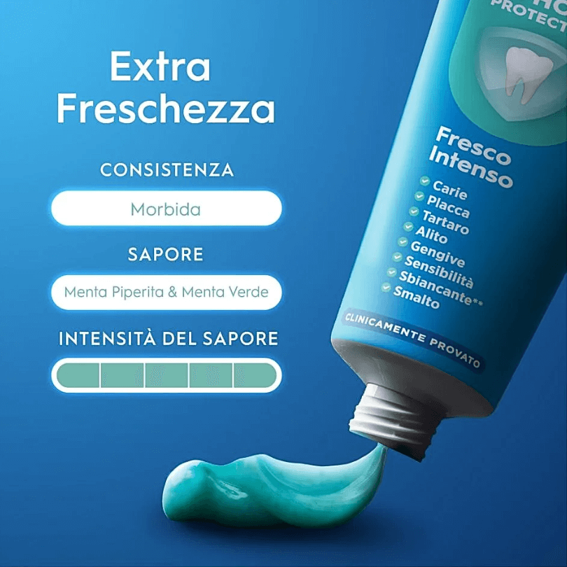 Oral-B Pro-Expert Fresco Intenso è un dentifricio ad azione antibatterica studiato per proteggere i denti dalla placca e offrire una sensazione di freschezza intensa e duratura. La sua formula avanzata con Fluoruro Stannoso crea uno scudo protettivo che mantiene la bocca pulita anche tra uno spazzolamento e l’altro. La combinazione di menta piperita, menta verde, mentolo e delicati sentori di vaniglia garantisce una freschezza aromatica massima, rendendo ogni spazzolata piacevole e rinfrescante.