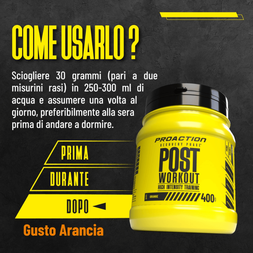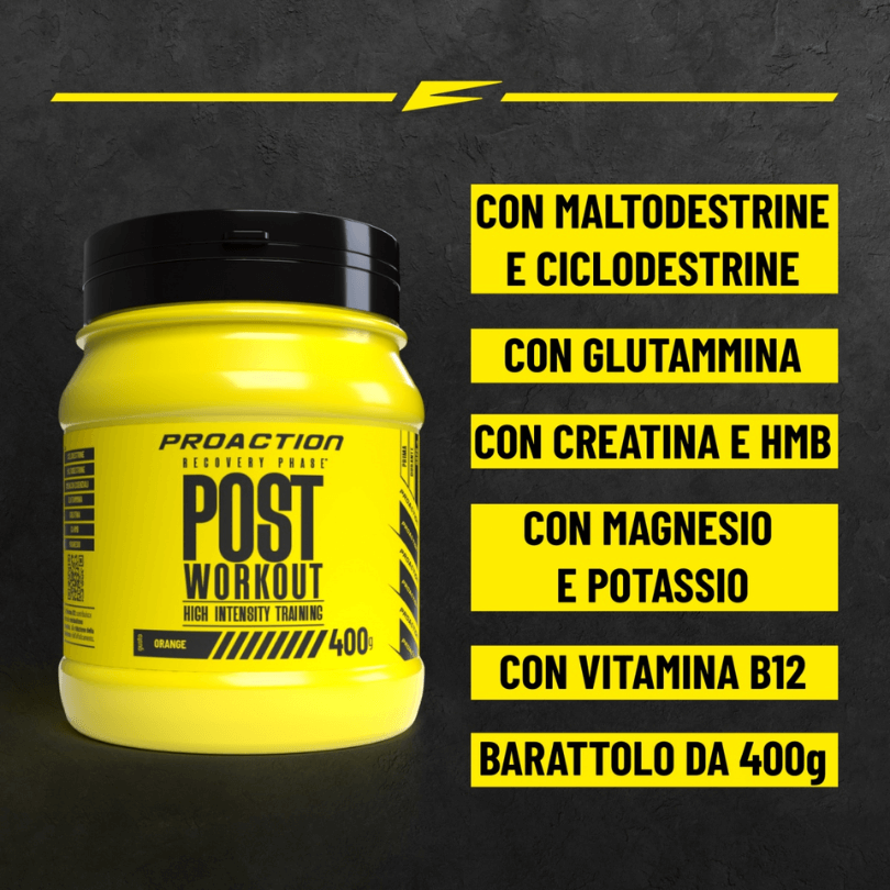 Post Workout 400 g di ProAction è un integratore alimentare completo studiato per gli atleti che praticano attività ad alta intensità e vogliono ottimizzare il recupero fisico post-allenamento. La sua formula supporta il contrasto del catabolismo muscolare, riduce l’affaticamento e favorisce la rigenerazione dei tessuti, aiutando a prepararsi al meglio per il prossimo allenamento. Include carboidrati a rilascio graduale, aminoacidi essenziali, creatina, HMB, magnesio, potassio e vitamina B12.