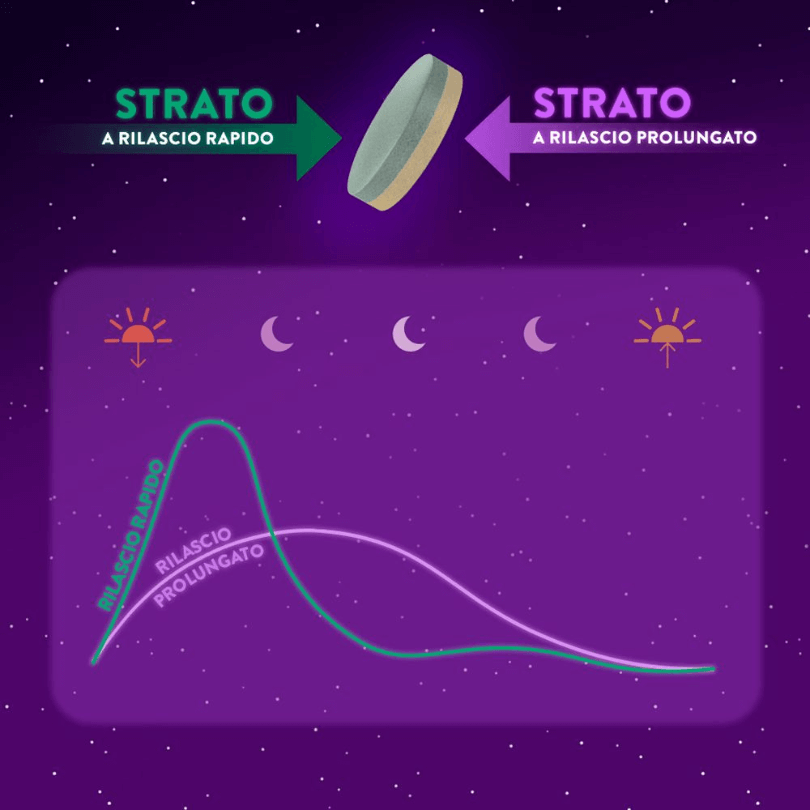 Agente di carica: cellulosa microcristallina; estratto di valeriana (Valeriana officinalis L., radice), estratto di melissa (Melissa officinalis L., foglie); agenti di carica: idrossipropilmetilcellulosa, idrossipropilcellulosa; agente di rivestimento: idrossipropilmetilcellulosa; agenti antiagglomeranti: sali di magnesio degli acidi grassi; agenti di rivestimento: idrossipropilcellulosa; coloranti alimentari: spirulina (Spirulina platensis) e mela (Malus domestica); agente di carica: croscarmellosa sodica; coloranti alimentari: cartamo (Carthamus tinctorius L.) e limone (Citrus lemon) (contenente: sciroppo di saccarosio, maltodestrina e acido citrico); vitamina B6 (piridossina cloridrato), melatonina; agente di rivestimento: diossido di silicio.